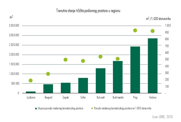 Iako je trenutno, u odnosu na broj stanovnika u prestonici, ponuda modernih kancelarija znatno niža od glavnih gradova u regionu centralne i jugoistočne Evrope, Beograd predstavlja primer održivog razvoja poslovnog prostora budući da se novoizgrađene poslovne zgrade u potpunosti izdaju u veoma kratkom roku.