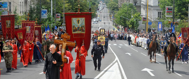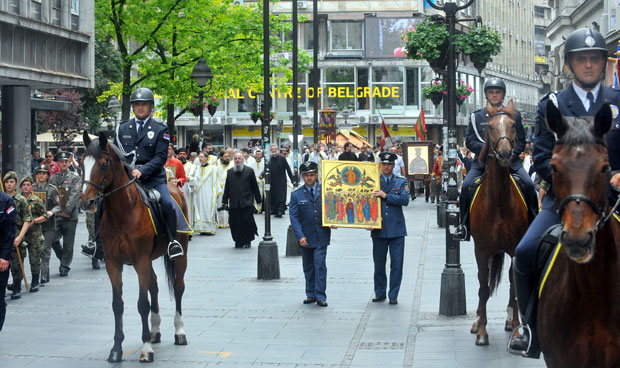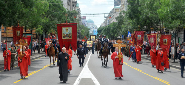 Na čelu litije je bio Jerusalimski krst, a iza njega barjak grada Beograda.