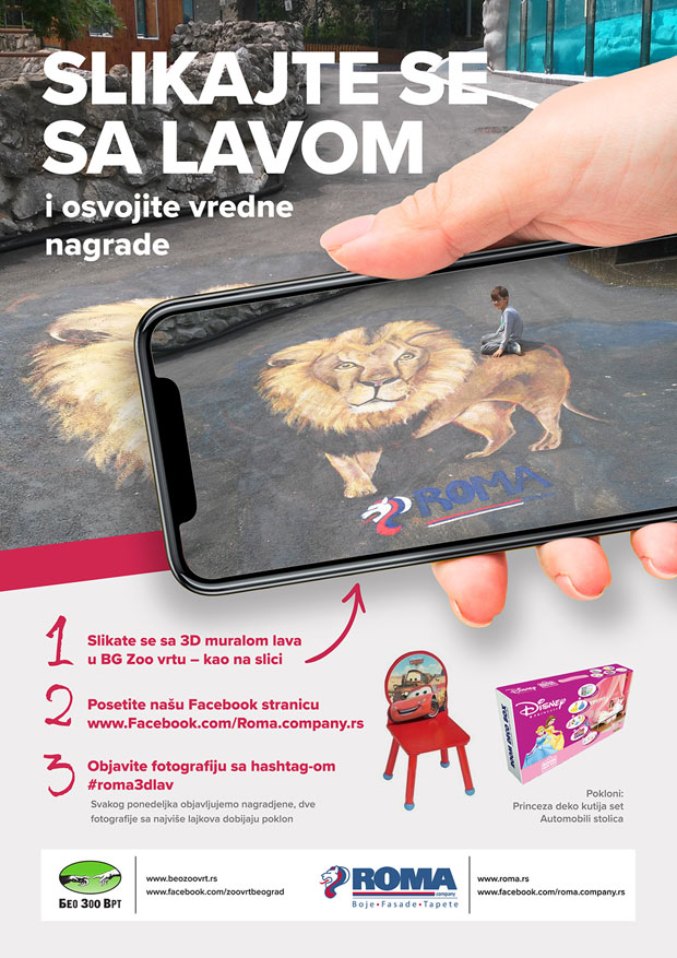 Radi se o street art - muralu lava, koji je poklon Roma company, čime je nastavljena uspešna saradnja ove dve institucije. Naime, slikarka Maja Živković oslikala je 3D lava u Beo zoo vrtu, kako bi veliki broj najmlađih posetioca imao još jedan kutak za ovekovečenje uvek divnih trenutaka provedenih u vrtu. Ovaj mural je već postao omiljeno mesto za fotografisanje najmlađih, a Roma company je odlučila da pokrene i veliku poklon akciju #Roma3Dlav u kojoj će učesnicima svakog ponedeljka od 24.juna deliti poklone. Da biste učestvovali, procedura je jednostavna: