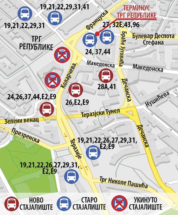 Kod Platoa dr Zorana Đinđića uspostavlja se stajalište "Trg republike" za autobuske linije 24, 37 i 44, kao i za noćne linije 15N, 27N, 32N, 37N, 56N, 75N, 101N, 304N, 511N, 704N i 706N u smeru ka Dorćolu. U Makedonskoj sada staju 28A i 41, kao i noćni 68N, 301N, 304N i 603N u smeru ka Domu omladine.