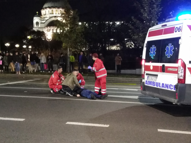 Težak udes kod Hrama Svetog Save, dve osobe povređene: Motorista oborio pešaka, pa motor odleteo i udario autobus (FOTO+VIDEO)
