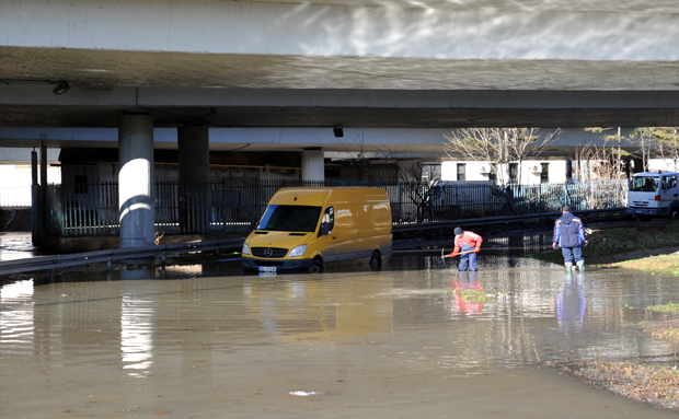 Na fotografijama sa lica mesta vidi se jezero ispod nadvožnjaka preko auto-puta, dok ekipe JKP “Vodovod i kanalizacija” saniraju havariju.
