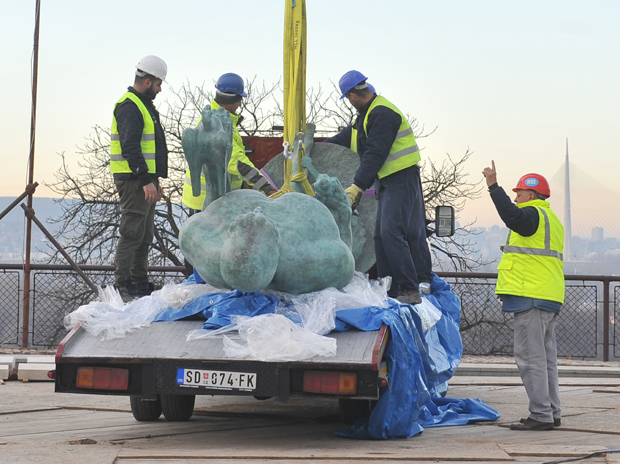 Spomenik, koji je juče dopremljen iz ateljea vajara Zorana Kuzmanovića iz Smedereva, radnici su dizalicom uspravili i ogradili zaštitnom ogradom.