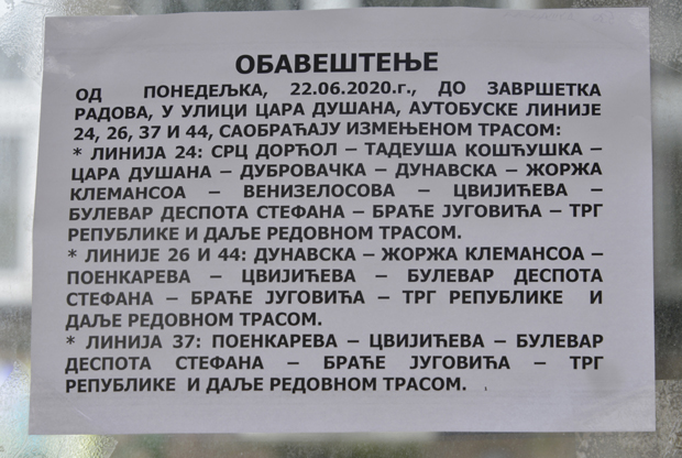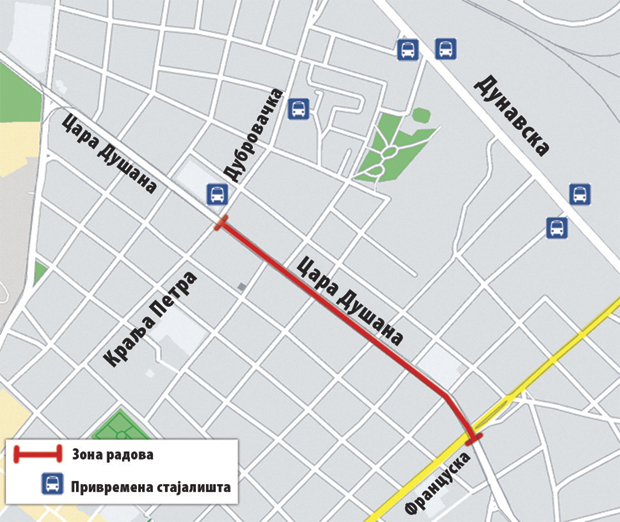 OBNOVA Ulice cara Dušana od Francuske do Kralja Petra počinje danas, iako je najavljivano da će početi 1. jula. Iz straha da posao rekonstrukcije ulice do Kalemegdana neće završiti do 1. septembra, izvođač radova rešio je da sa raskopavanjem krene ranije. Od danas, linije 24,26,37,44,79 i 5A saobraćaju izmenjenim trasama.