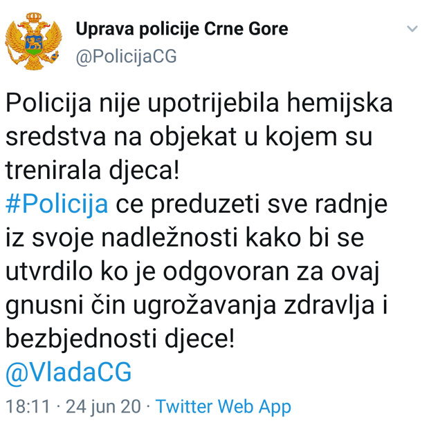 Uprava policije saopštila da nije upotrebila hemijska sredstva na objekat u kojem su trenirala deca