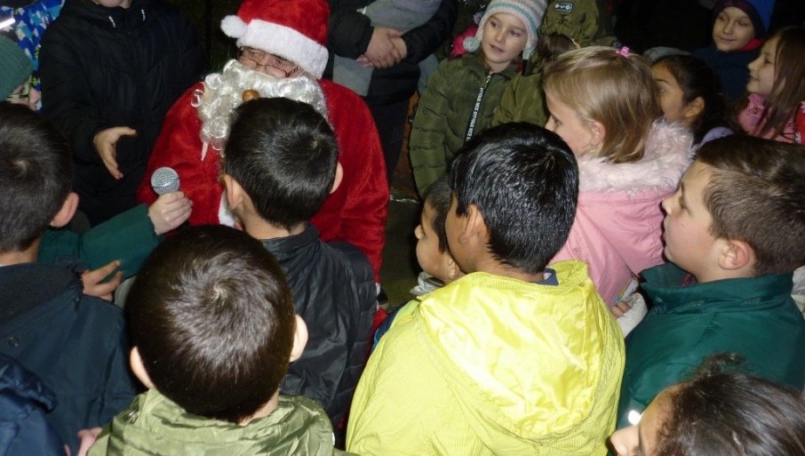 UZ bajkere, mađioničara i novogodišnje paketiće, malošani u selu Belo blato, zajedno sa svojim roditeljima, ali i brojnim starijim meštanima, tradicionalno su okitili jelku ispred Osnovne škole "Bratstvo jedinstvo", ukrašavajući je šarenim lampionima.