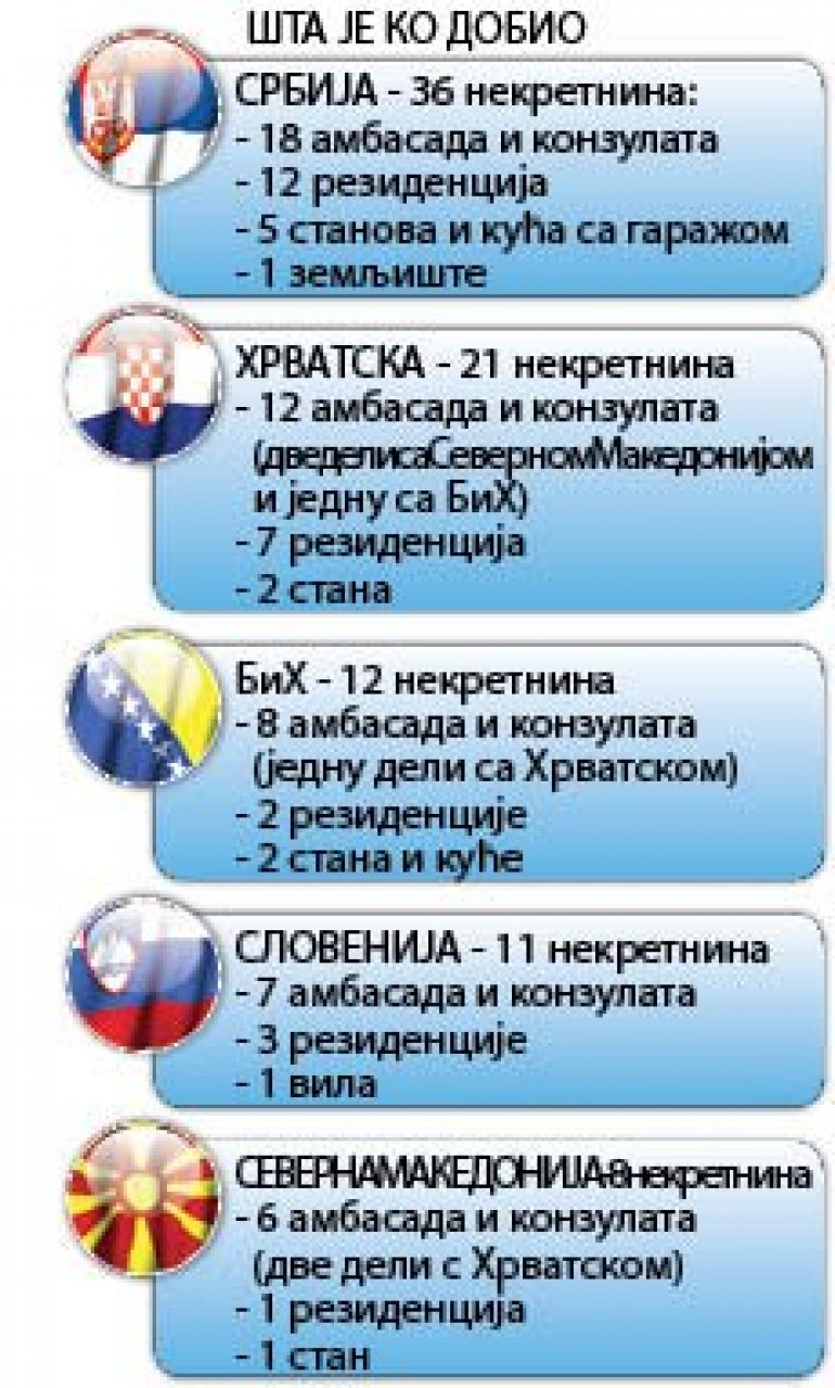SRBIJA po tome ima pravo ukupnog učešća od 39,5 odsto, Bosna i Hercegovina - 15, Hrvatska - 23,5, Severna Makedonija - 8 i Slovenija - 14 odsto. Od 85 raspodeljenih objekta, 36 je pripalo našoj zemlji, dok su ostali sukcesori dobili ukupno 49 (Hrvatska 21, BiH 12, Slovenija 11 i Severna Makedonija 5).