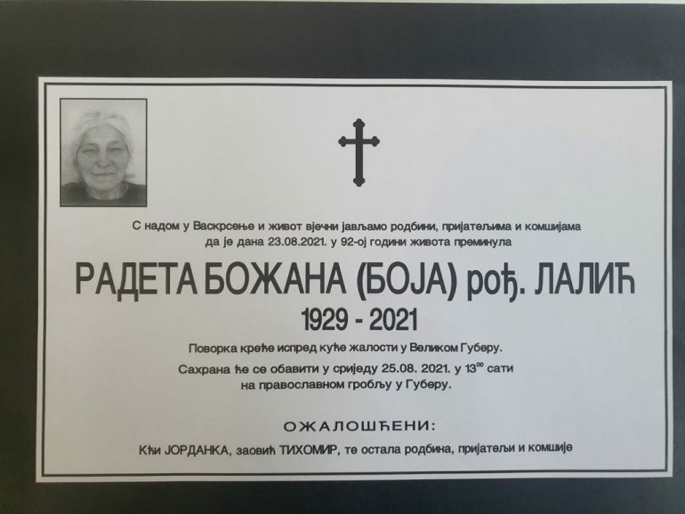 OTIŠLA je Božana Boja Lalić, udato Radeta, poslednja od 14 koji su preživeli krvavi ustaški pir na Ognjenu Mariju 1941. kada je u jamu Ravni Dolac kod Livna bačeno 218 živih Srba. Usnula je u ponedeljak, u 92. godini, u Velikom Guberu, a sahrana je sutra u 13 časova na Srpskom pravoslavnom groblju u ovom livanjskom selu.