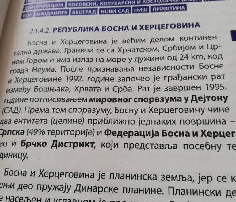 Reč je o geografiji za sedmi razred, gde je u naslovu lekcije, Bosna i Hercegovina nazvana "Republika Bosna i Hercegovina". Ovo je uznemirilo neke roditelje poreklom iz Republike Srpske, koji su se i obratili našoj redakciji.