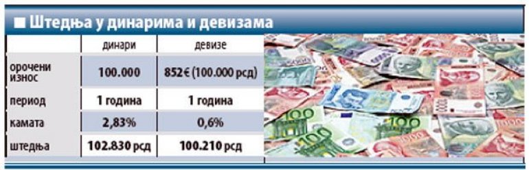 Ovi podaci ne čude, jer je analiza pokazala da je isplativije štedeti u dinarima. Kamatne stope na dinarsku štednju kreću se orijentaciono oko dva odsto na period oročenja od tri meseca, do četiri odsto kada se novac oročava na tri godine, dok nominalna kamatna stopa na deviznu štednju za kratke periode jedva prelazi nulu.