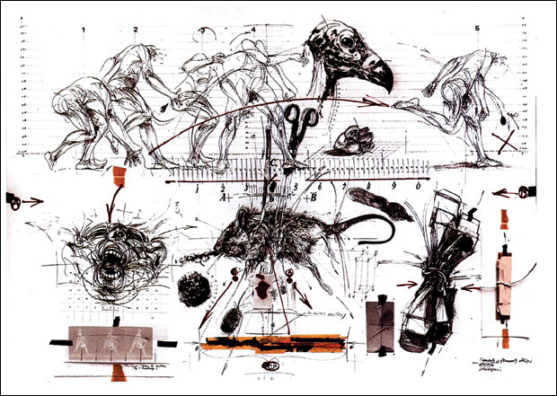 BACAJUĆI se u belinu lista papira, Veličković vrši skok. On mora, bez prestanka, da savlada istu prepreku: nemogućnost da crta uključuje nemogućnost da nametne svoju misao. U potez perom on unosi energiju trkača, šampiona skoka udalj, da bi prešao prethodno osvojene granice, da bi ih, ne zaboravivši ih, pomerio.