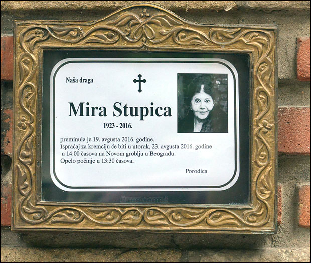 TIHO i dostojanstveno, ispraćena je danas na večni počinak naša velika umetnica Mira Stupica. Porodica, prijatelji i kolege oprostili su se od slavne glumice u kapeli beogradskog Novog groblja, uz opelo i pesmu "Tiho noći", bez pompe i govora. Posle opela ožalošćena rodbina i prijatelji u kapeli ispratili su Miru uz poslednji aplauz.