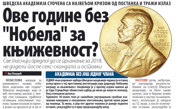 Ova (ne)očekivana odluka posledica je jedne od najvećih kriza u ovoj uglednoj insituciji od njenog osnivanja, izazvane seks-skandalom. Tako je lavina otpužbi za seksualno uznemiravanje, pokrenuta u Holivudu, stigla i do Stokholma. Glavni krivac za aferu u Švedskoj akademiji je poznati kulturni poslenik Žan-Klod Arno, suprug pesnikinje Katarine Frostenson, članice Akademije.