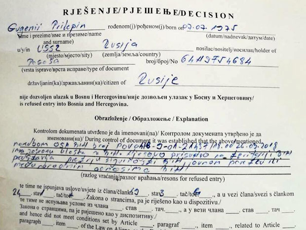 - Naredbom Obaveštajno-bezbednosne agencije (OBA) BiH od 26. marta 2018. godine Prilepin ima zabranu ulaska u BiH. Njegovo prisustvo u BiH predstavlja pretnju bezbednosti, javnom poretku ili međunarodnim odnosima BiH - navodi se u rešenju koje je uručeno ruskom piscu.