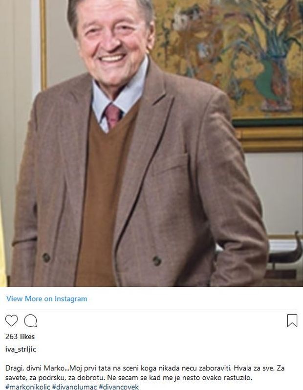 - Dragi, divni Marko...Moj prvi tata na sceni koga nikada neću zaboraviti. Hvala za sve. Za savete, za podršku, za dobrotu. Ne sećam se kad me je nešto ovako rastužilo - poručila je Iva Štrljić.
