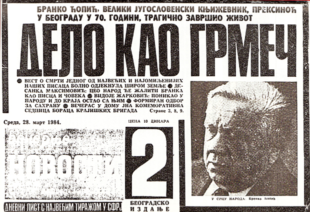 STOJIM raspet između smirene djedove vatrice, koja postojano gorucka u tamnoj dolini, i strašnog blještavog mjesečevog požara, hladnog i nevjernog, koji raste nad horizontom i silovito vuče u nepoznato - napisao je svojevremeno Branko Ćopić, nagoveštavajući ono što će rezultirati skokom s Brankovog mosta jednog prohladnog marta 1984. godine.