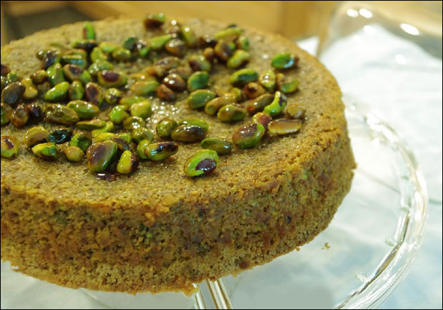 Za testo: 230 g šećera, 150 g neslanih pistaća, pola kašičice kardamoma, 50 g pečenih badema, 200 g putera, 50 ml maslinovog ulja, rendana limunova kora, kašičica vanile, 4 jaja, 50 g brašna i kašičica praška za pecivo. Za sirup: 150 g šećera, 200 ml vode, sok od dva limuna i šaka celih pistaća.