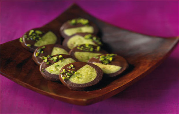 U posudu sipajte pola količine brašna, šećera u prahu i putera, dodajte kakao prah i jaje, kratko umutite mikserom i rukama zamesite glatko testo. Podelite ga na četiri dela, umotajte u plastičnu foliju i stavite u frižider. Mlevene pistaće pomešajte sa ostatkom brašna, putera i šećera u prahu, jajetom, rukama zamesite testo, oblikujte četiri rolata dužine 20 cm, umotajte u foliju i ohladite. Tamno testo tanko razvijte, poprskajte vodom, na sredinu stavite zeleni rolat, preklopite tamnim testom, pritisnite, uvijte u foliju i ohladite dva sata. Isecite na komade debljine 1/2 cm, poređajte u podmazan pleh i pecite u rerni na 180 stepeni 10 minuta. amnu čokoladu otopite na pari, umočite polovinu kolačića, pospite pistaćima, osušite i servirajte.