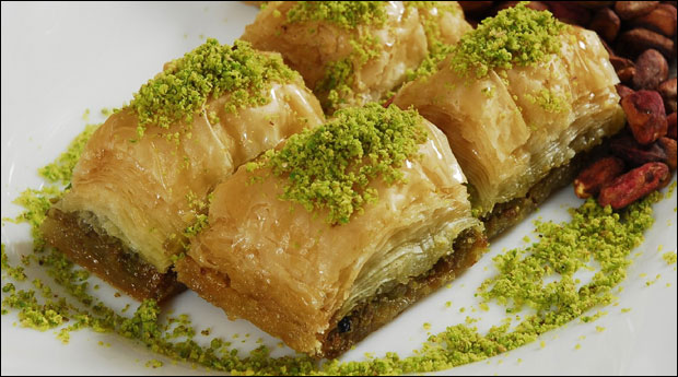 Potrebno je: 500 g tankih kora, 200 g putera i 350 g mlevenih pistaća. Za šerbet: 300 g šećera, 500 ml vode i sok od limuna ili pomorandže.