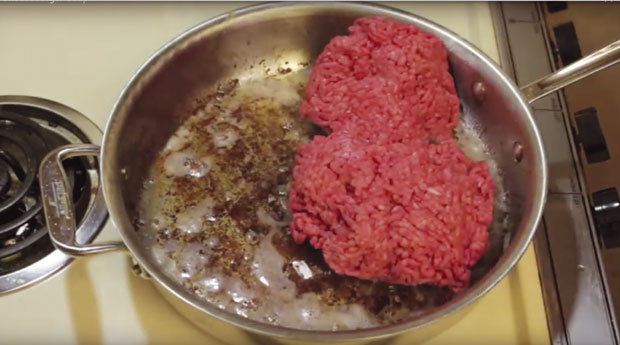 1 – Listove slanine ispržite u tiganju sa obe strane da budu hrskavi. Izvadite na tanjir sa papirnim ubrusom i ohladite. Na istoj masnoći pržite mleveno meso, dok ne promeni boju. Sklonite s ringle i ostavite sa strane.