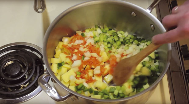 2 – U lonac stavite kockice krompira, krupno rendanu šargarepu, seckani crni i beli luk, usitnjenu zelenu papriku i celer. Nalijte mesnim bujonom i kuvajte na srednjoj temperaturi dok se povrće ne skuva, povremeno promešajte.
