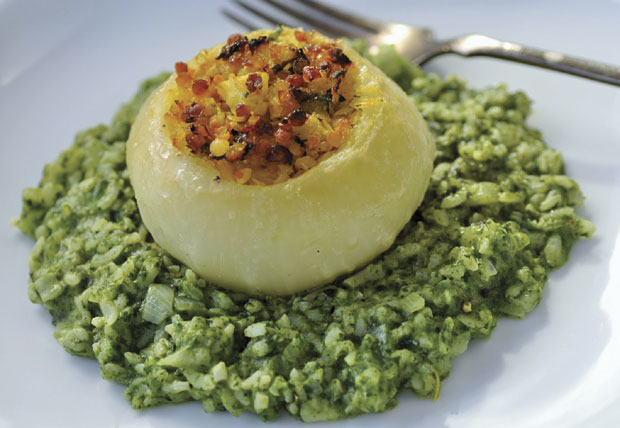 Kelerabe skuvajte, ocedite i izdubite. Zagrejte kašiku ulja, ispržite crni luk, dodajte polovinu seckane kelerabe, sočivo, kurkumu, sok od limuna i peršun. Napunite kelerabe, stavite u podmazanu posudu, poprskajte uljem i pecite 30 minuta u rerni na 200 stepeni. Blitvu blanširajte u kipućoj vodi, ocedite i izblendirajte. Na zagrejanom puteru i maslinovom ulju kratko ispržite pirinač. Umešajte crni luk, ostatak seckane kelerabe, vino i bujon. Kad proključa, dodajte blitvu, posolite, pobiberite, smanjite vatru i kuvajte dok ne postane kremasto.