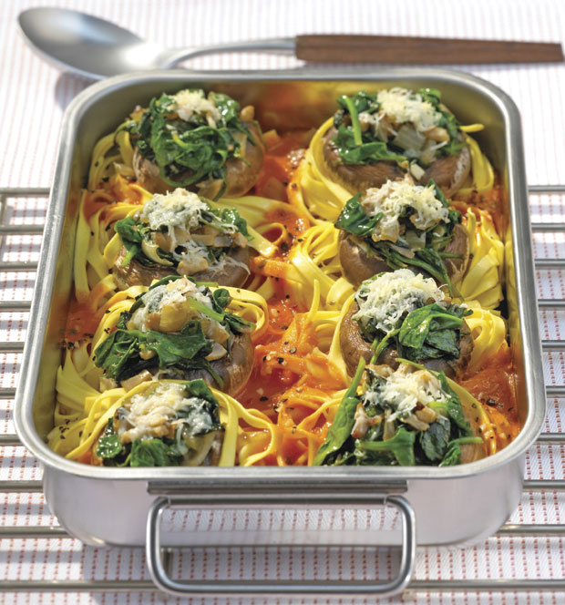 Paradajz izmešajte sa šećerom, majoranom, sirćetom, solju i biberom. Testeninu skuvajte prema uputstvu na pakovanju i ocedite. Posudu namažite kašikom putera, napravite osam gnezda od testenine i prelijte paradajz sosom. Šampinjone očistite, stabljike isecite na kockice, a glavice stavite na vrh svakog gnezda. Na ostatku putera ispržite kockice crnog luka i šampinjona, umešajte spanać i napunite šampinjone. Pospite pinjolama i parmezanom, začinite mlevenim biberom i pecite u rerni na 180 stepeni oko 20 minuta. Servirajte toplo.