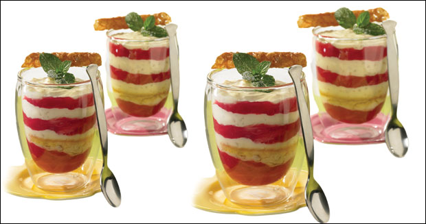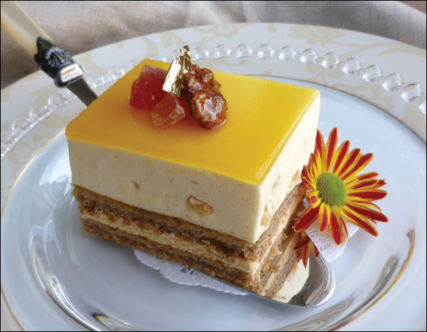 Sastojci za testo: 150 g šumskog meda, 200 g putera, 3 jaja, kesica vanile, 150 g brašna, 2 kašičice praška za pecivo, kašičica cimeta , 150 g mlevenih oraha i 100 g slatkog višnja krema. Za puter krem: 250 g putera, 4 jaja, 100 g šećera, 150 g karamel krema i 3 kašike likera od pomorandže. Za oranž mus: 230 + 40 g šećera, 120 g belanaca, 12 listova želatina, 550 ml soka od pomorndže, 500 g šlaga, 100 g mango pirea i 100 g kandirane narandžine kore. Za preliv: 100 ml pomorandžinog soka, 100 g mango pirea, 50 g šećera i 2 lista želatina.