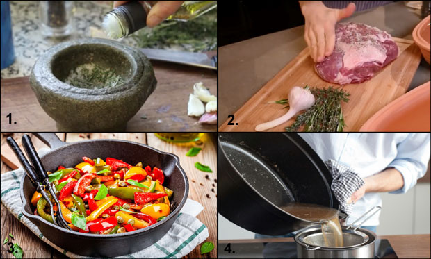 1 – Beli luk oljuštite, isecite na manje komade, stavite u avan, dodajte ruzmarin, dve kašike ulja, so biber i izmešajte. But operite, prosušite krpom i oštrim nožem uklonite kožu.