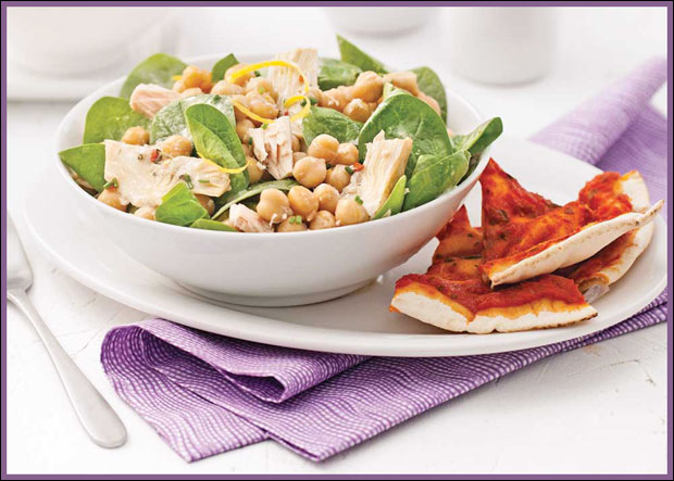 U činiji za salatu pomešajte maslinovo ulje sa rendanom limunovom korom, sokom od limuna i tahini sosom. Kuvane leblebije isperite, dobro iscedite i dodajte u pripremljeni sos. Zatim umešajte tunjevinu, očišćeni mladi spanać, artičoke i seckani vlašac. Posolite i pobiberite po želji, dobro izmešajte i poslužite uz tostiran hleb ili picu.