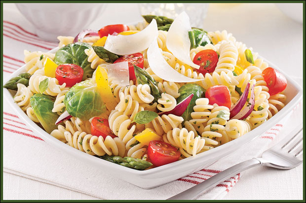 Za 4 osobe potrebno je: 150 g prokelja, 12 špargli, 350 g posnih testenina, 12 čeri paradajza različitih boja, glavica crnevog luka, žuta paprika, čen belog luka, 3 kašike maslinovog ulja, 2 kašike seckanog bosiljka, 2 kašike seckanog peršuna, so i biber.