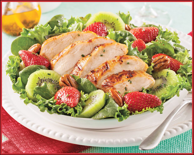 Za 4 osobe potrebno je: 4 pileća prsa bez kožice, 600 g reckaste zelene salate, 8 krupnih jagoda, 2 kivija narezana na kolutove, 130 g oraha. Za preliv: 80 ml maslinovog ulja, 80 ml javorovog sirupa, 2 kašike seckanog vlašca, malo soli, 1 kašičica parike.