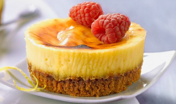 Keks stavite u kesu, oklagijom izdrobite i izmešajte sa komadima mekog putera. Smesu ravnomerno rasporedite u osam podmazanih posudica, kašikom ili prstima pritisnite dno i ohladite u frižideru. Krem sir izmešajte sa dve kašike šećera, rendanom limunovom koricom, ekstraktom vanile, ispasiranom bananom i mutite mikserom dok smesa ne bude glatka. Ravnomerno rasporedite u posudice sa keksom i vratite u frižider. Ohlađene tortice pospite smeđim šećerom i karamelizujte pomoću specijalnog aparata ili zapecite u rerni tri minuta, dok korica ne bude zlatno-smeđa i hrskava.