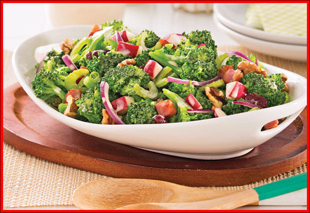 Za 4 osobe potrebno je: 500 g obarenog bokolija iseckanog na cvetiće, 2 jabuke, 100 g slanine iseckane na kockice, glavica crnog luka, stabljica celera, 100 g sušenih brusnica, 100 g prepečenih oraha, ulje. Za preliv: 80 g majoneza, 3 kašike jabukovog sirćeta, 2 kašike grčkog jogurta, 2 kašike javorovog sirupa ili bagremovog meda, kašika maslinovog ulja, 2 kašičice dižonskog senfa, so i biber.