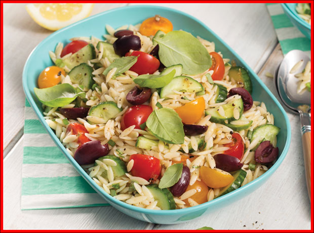 Za 4 osobe potrebno je: 400 g testenina u obliku pirinča, 160 ml grčkog vineret sosa, 18 čeri paradajza, 3 manja krastavca, 150 g iseckanih Kalamata maslina, so i biber.