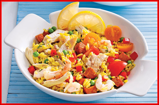 Za 4 osobe potrebno je: 500 ml pileće supe, 150 g kobasica iseckanih na kocke, 250 g pirinča dugog zrna, 6-7 komadića (iglica) šafrana, 250 g graška, 2 kašike limunovog soka, 4 kašike seckanog peršuna, pola crvene paprike, pola glavice crvenog luka, 12 čeri paradajza, 150 g obarenih račića, 250 g kuvane piletine, 80 ml maslinovog ulja, so i biber.