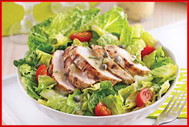 Za 4 osobe potrebno je: 4 pileća bela mesa bez kostiju i kožice, 3 glavice salate (samo srednji deo), 2 stuka mladog crnog luka, 250 g čeri paradajza, kašika kapra, so i biber. Za marinadu: 80 ml soka od limuna, 60 ml vode, 3 kašike dižonskog senfa, 2 kašike maslinovog ulja, 2 čena belog luka, so i biber.