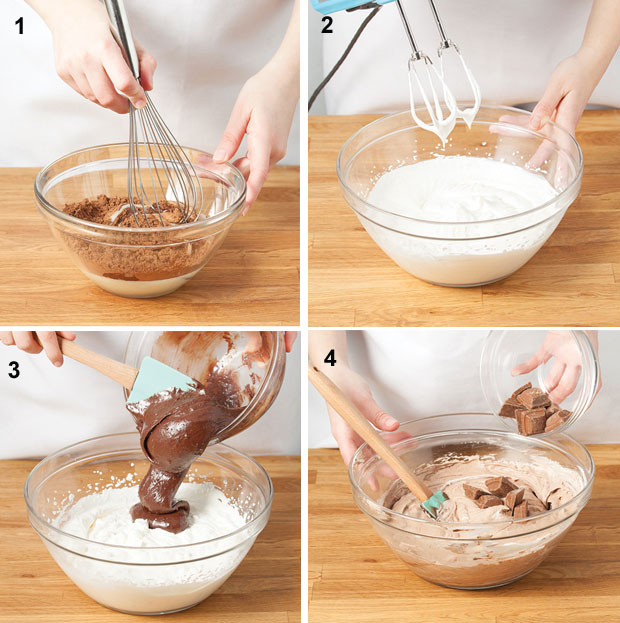 3. Uz pomoć špatule postepeno preručite kakao krem u činiju sa umućenom pavlakom i pažljivo izmešajte