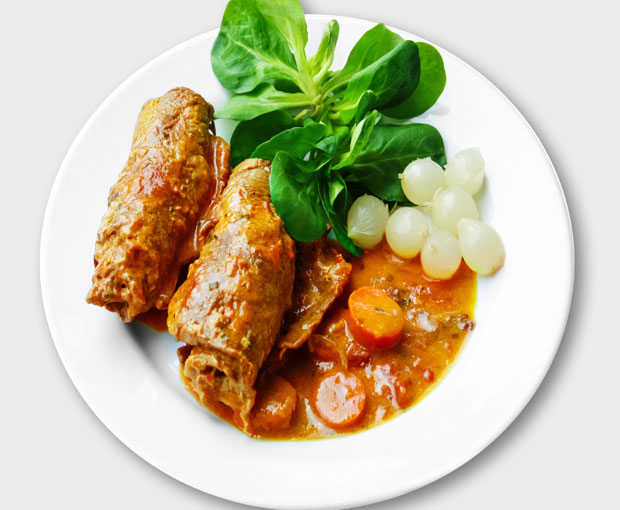 Za 4 osobe potrebno je: 4 veće goveđe šnicle, 2 kašike pesto sosa sa sušenim paradajzom, 12 šnita kuvane slanine, 8 tankih kriški gauda sira, 500 g kratko obarenog isceđenog spanaća, maslinovo ulje, so i biber.