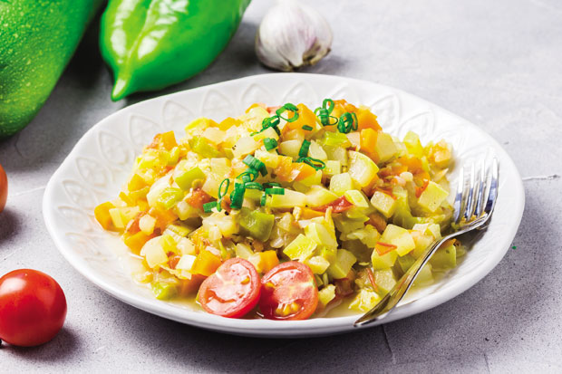 Sitno iseckajte crni, crveni i beli luk, šargarepu, paradajz, tikvice i krompir isecite na kocke, a paprike na trake. U dubljem tiganju zagrejte maslinovo ulje, ubacite crni i crveni luk i dinstajte dok ne dobiju staklastu boju. Zatim ubacite šargarepu i krompir, nalijte malo vode i kuvajte 15 minuta. Dodajte papriku, so, biber, sitno seckanu svežu mirođiju (može i sušena) i kuvajte još pola sata.