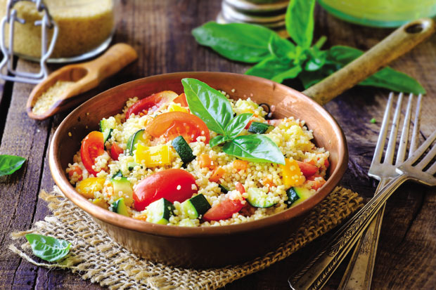 Potrebno je: 2 šargarepe, praziluk, 200 g pečuraka, crvena i zelena paprika, 100 g čeri paradajza, 3 kašike soja sosa, so, biber, maslinovo ulje, 120 g kus-kusa, 20 g putera.