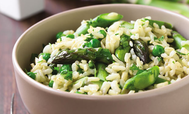 Potrebno je: veza špargle * 2 manja mlada luka ili praziluk slične veličine * 240 g pirinča * 5 kašičica ulja po mogućstvu maslinovog * 80 ml suvog belog vina * 480 ml vrele vode * so l biber.