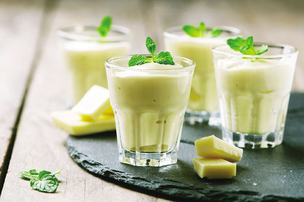 Na pari umutite žumanca sa šećerom. Dodajte vodu i čokoladu i mešajte dok se čokolada ne rastopi. Sklonite sa vatre i dodajte slatku pavlaku, promešajte i sipajte u čaše. Ohladite nekoliko sati u frižideru i ukrasite listićima nane.
