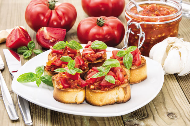 Na malo maslinovog ulja kratko prodinstajte beli luk, sipajte paradajz pire i bosiljak, posolite i pobiberite, ostavite dva-tri minuta da se sjedini sa lukom. Zagrejte rernu na 180 stepeni. Tost premažite maslinovim uljem, stavite krem sir, paradajz pire i od gore iseckane komade paradajza. Pospite bosiljkom ili peršunom.