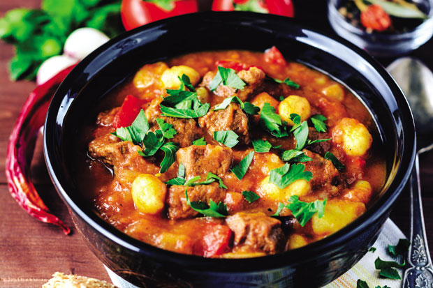 Luk sitno iseckajte, pa ga izdinstajte dok ne porumeni.Dodajte meso isečeno na kocke, začinite i dinstajte. Sipajte sok od paradajza i ljutu papriku, pa nastavite da dinstate još nekoliko minuta. Dolijte vodu da prekrije meso, zatim lovorov list i peršun, pa ostavite da se krčka na srednjoj temperaturi oko sat i po vremena uz povremeno mešanje i dodavanje vode.