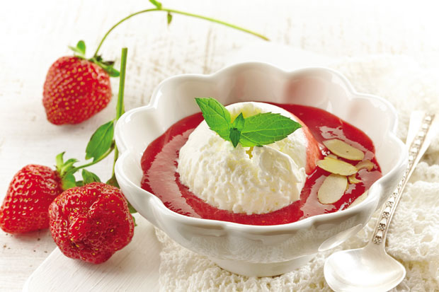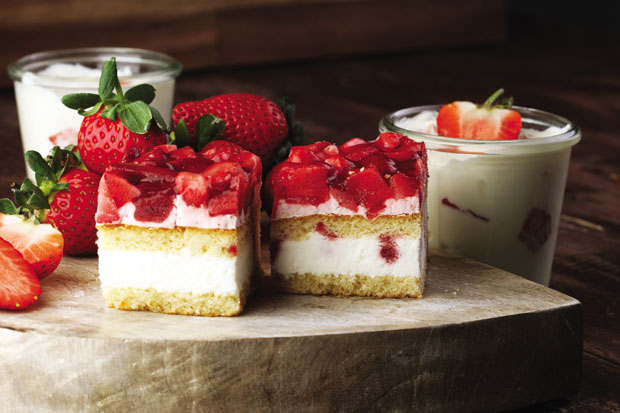 U kalup položite donji deo biskvita i namažite ga polovinom džema. Na sloj džema namažite polovinu krema i poravnajte. Na krem položite drugu polovinu biskvita i namažite ga drugom polovinom džema. Namažite ostatak krema i poravnajte vrh torte. Hladite barem četiri sata. Ohlađenu tortu odvojite od kalupa, poravnajte stranice i ukrasite svežim jagodama