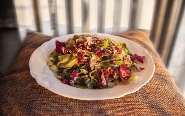 Oprani radič iseckajte na trakice širine do 3 cm. U dublji tiganj sipajte obično ulje, na njega iseckani luk, dodajte odmah radič i lovorov list, pa sve zajedno dinstajte. Kada radič omekša, sipajte crveno vino i dodajte kocku za supu. Mešajte dok se kocka ne rastopi, a onda dodajte iseckane masline, biber, so ili začin. U tako spremljenu masu umešajte izabranu pastu, povadite lovorov list, po vrhu pospite parmezan i služite.