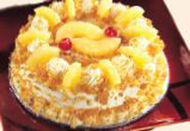 Prvo razdvojte jaja, pa žumanca penasto umutite sa šećerom i vodom dok se malo ne zgusnu. Brašno, gustin, kakao i prašak za pecivo pomešajte pa kroz retku cediljku prosejte na masu od jaja. U belanca dodajte so pa ih ulupajte u čvrst sneg. Zatim ih dodajte u prethodno pripremljenu masu pažljivo mešajući varjačom dok se sve ne izjednači. Stavite u pleh obložen pek papirom i pecite na 180 stepeni 35 minuta. Kada je torta pečena, ostavite je da se skroz ohladi, a zatim vodoravno presecite da dobijete dve kore. Onda uzmite cediljku za salatu i poređajte oceđeni ananas u kolutovima. Sok iz kompota možete koristiti za želatin. Šupljine ananasa popunite oceđenim mandarinama ili trešnjama. Listove želatina natopite u soku od ananasa, pa ih polako rastopite na blagoj vatri. Pavlaku za šlag i vanilin šećer čvrsto umutite, u to dodajte rastopljeni želatin pa dobro promešajte. Jednu ispečenu koru isecite na male kocke ili izlomite rukama. Stavite je zajedno sa ostatkom mandarina i ananasa u komadićima u umućenu pavlaku za šlag. Masu sipajte u cediljku obloženu ananasom i mandarinama, sve poravnajte pa odozgo stavite drugu koru. Potom tortu prebacite na tanjir tako da cela kora bude donja, a odozgo ananas. Ostavite je najmanje osam sati u frižideru, a kada se dobro stegne, pripremite preliv za voćne torte i prelijte tako da se popune sve šupljine. Možete staviti i šlag i dekorisati jagodama ili nekim drugim voćem po želji.