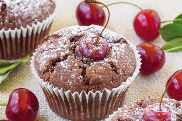 Čokoladu istopite na pari i ostavite da se prohladi. Šećer i puter penasto umutite pa dodajte jedno po jedno jaje. Mutite oko tri minuta. Brašno i prašak za pecivo pomešajte i dodajte u pripremljenu smesu od jaja. Dodajte mleko. Na kraju umešajte čokoladu i očišćene i prepolovljene trešnje i promešajte varjačom. Uključite rernu na 180 spepeni da se zagreje. Nauljite i pospite brašnom kalupe za mafine. Sipajte 3/4 smese u svaki kalup, ali ne do vrha. Mafina ima za 16 komada, pa ih pecite u dve ture, po 20 minuta. Proverite čačkalicom da li je pečeno, ako je suva jeste. Pečene mafine ohladite i premažite glazurom. Za glazuru umutite penasto puter i šećer. Čokoladu istopite na pari. Ostavite da se malo ohladi. U vrelu vodu dodajte kakao i brzo izmešajte, jer se brzo zgusne. Sve zajedno umutite mikserom i premažite mafine. Ukrasite trešnjama. Mafine ohladite i držite u frižideru.