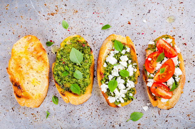 Francuski baget narežite na kriške. Pomešajte maslinovo ulje i sitno seckan beli luk i tom mešavinom premažite hleb. Zapecite pet minuta u rerni. Kad se hleb ohladi, premažite ga pestom od bosiljka. Pršutu narežite na malo veće komade, pa stavite po tri-četiri tanka komada na svako parče hleba. Prekrijte sa malo mocarele i vratite nazad u rernu da se sir otopi.